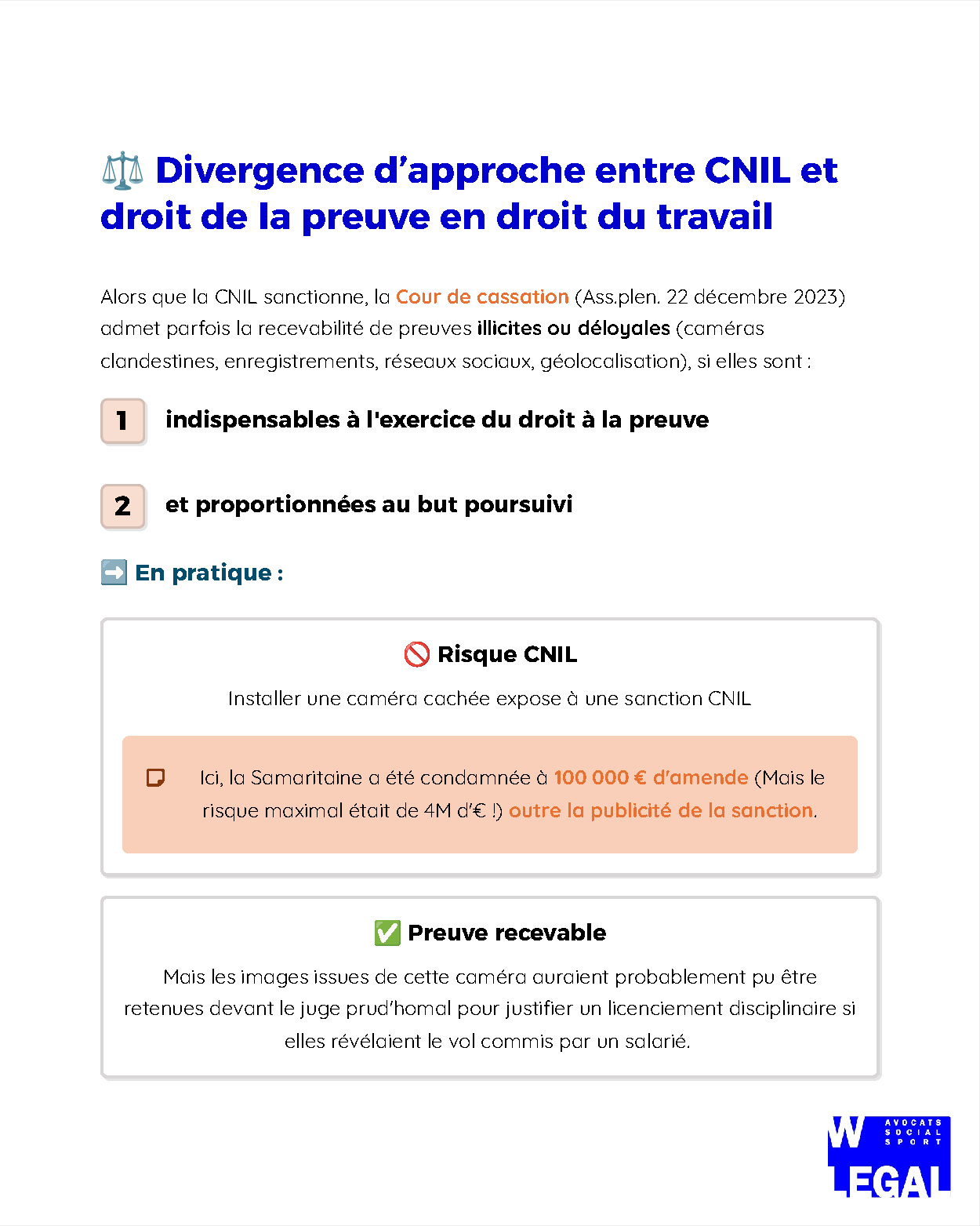 La CNIL peut sanctionner un dispositif illégal (par exemple une caméra cachée), mais la justice peut malgré tout accepter ces images comme preuve si elles sont indispensables et proportionnées.